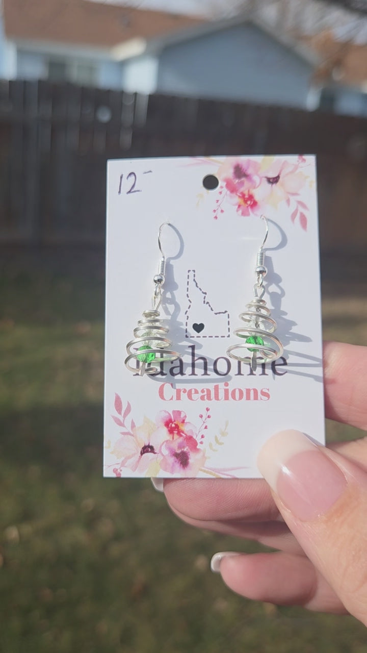 These cute green glass beads hang in the center of a beautiful spiral tree that is made from solid silver wire. These trees hang on sterling silver plated earring hooks.
