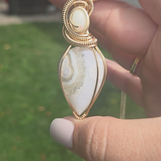 This stunner of a piece is a beautiful white agate wrapped in 14kt gold. Its finished with a big beautiful opal on the top. This piece is wrapped in 14kt gold fill wire, not just gold plated. It hangs on a 20 inch 14kt gold plated sterling silver chain. This piece is lovingly wrapped by hand.