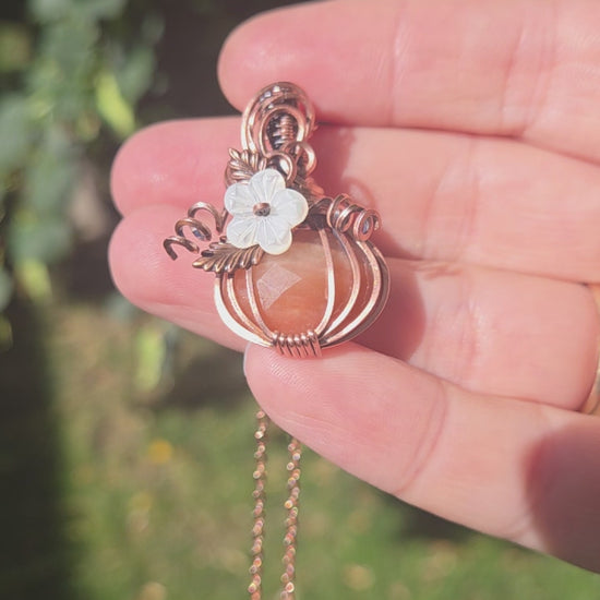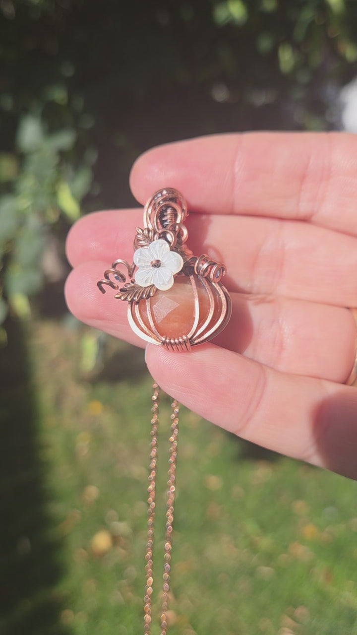 This beautiful pumpkin is a faceted sunstone wrapped in solid copper wire. Its finished with a mother of pearl flower and copper leaves. It hangs on an 20 inch copper chain.Β