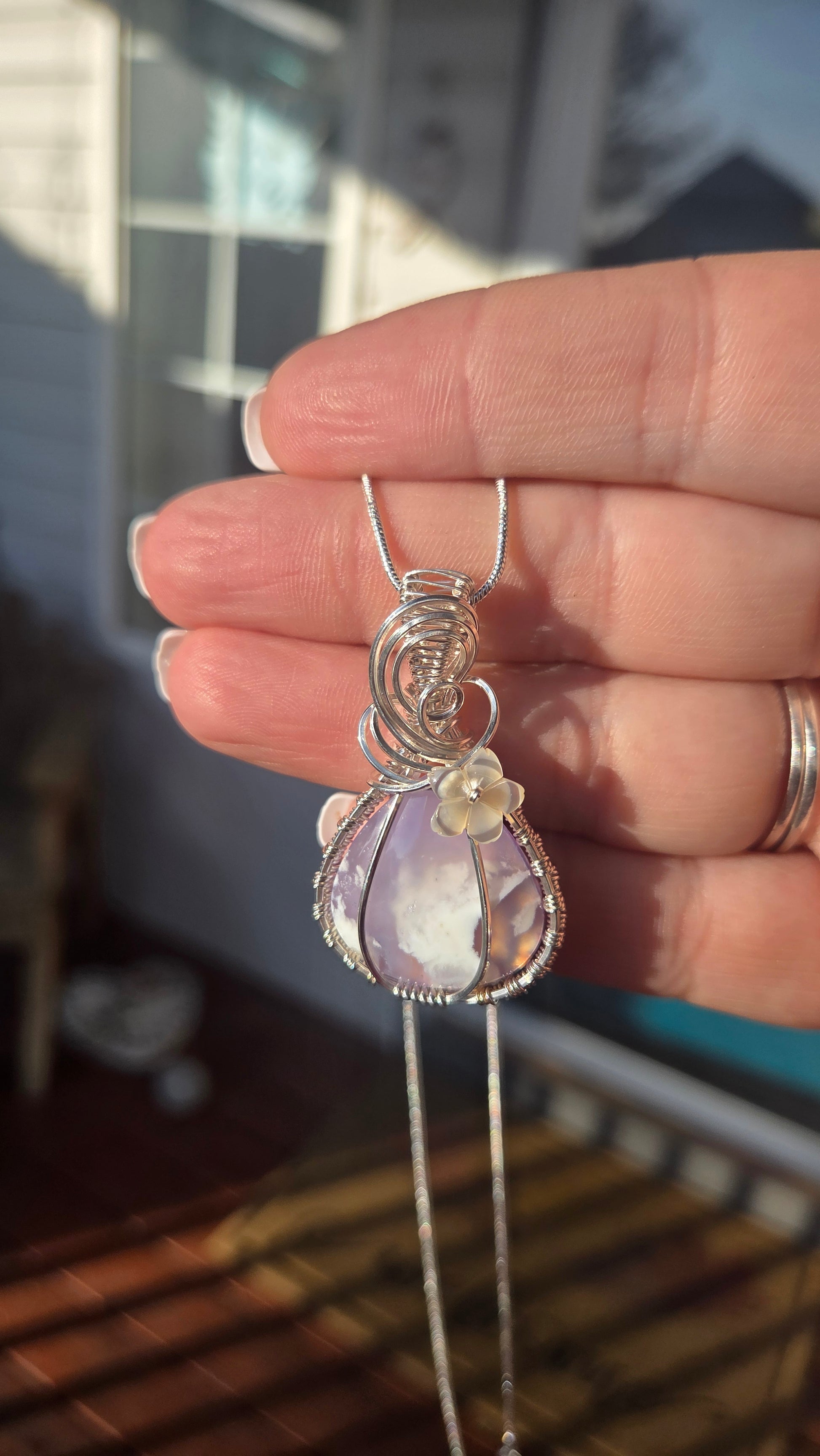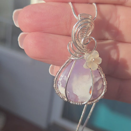 I just finished polishing this beautiful pendant and it's ready to find a home. This is a plume agate stone that has been layered over a colored backing to give it that stunning pink and orange flash. This piece is wrapped in 5 pieces of solid .925 sterling silver wire that has sterling wire woven between them. It has a mother of pearl flower finish on the front.