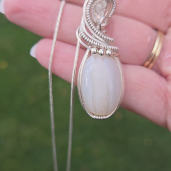 This stunning IDAHO seam agate was cut, shaped and polished by myself. It is wrapped in real solid argentium silver wire. It ia finished with sterling silv3r beads and it hangs on an 18 inch sterling silver chain. If you'd like a 20 inch chain please request it in the checkout notes.